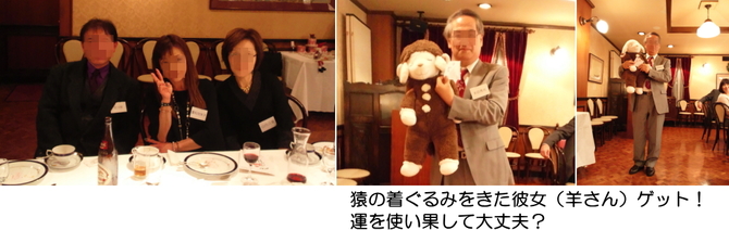 2015年もあと残すところ10日あまり…皆様にはどんな一年だったでしょう?『馬車道十番館』は3回目。T個人はお料理、ピアノ演奏をしっかりと堪能できました。ゲームについては、直前のA氏のアドバイスにより110円ゲームにチャレンジ。勝ち抜き&負け抜きを同時に行うパターンを採用してみました。100円ゲームより面白かった!今年A賞をゲットしたHさん。猿の着ぐるみを着た羊の彼女を引き当てた。末永くお幸せに!