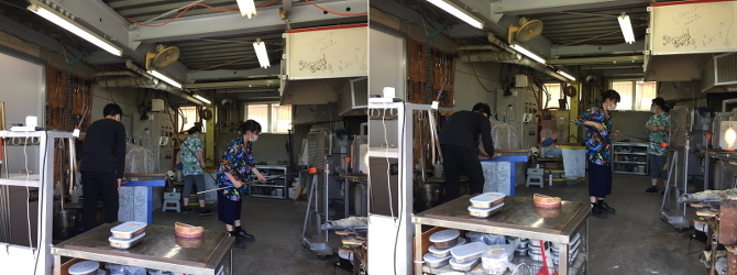 ガラス系ではトンボ玉、ステンドガラスを体験済み。本日は吹きガラス体験。コップ・ぐいのみ・小鉢・一輪挿し・ピッチャー・ペーパーウエイトなど制作できるとのこと。吹きガラスは陶芸と違い、工程も多く、難易度も高く、体験できました!…レベル。しかし器の形、色の付け方、選択肢多く、またやりたい!と思え、期待以上でした。その後ランチは木かげ茶屋。まだ6月なのに暑すぎる本日、遠くからのご参加ありがとうございました。
